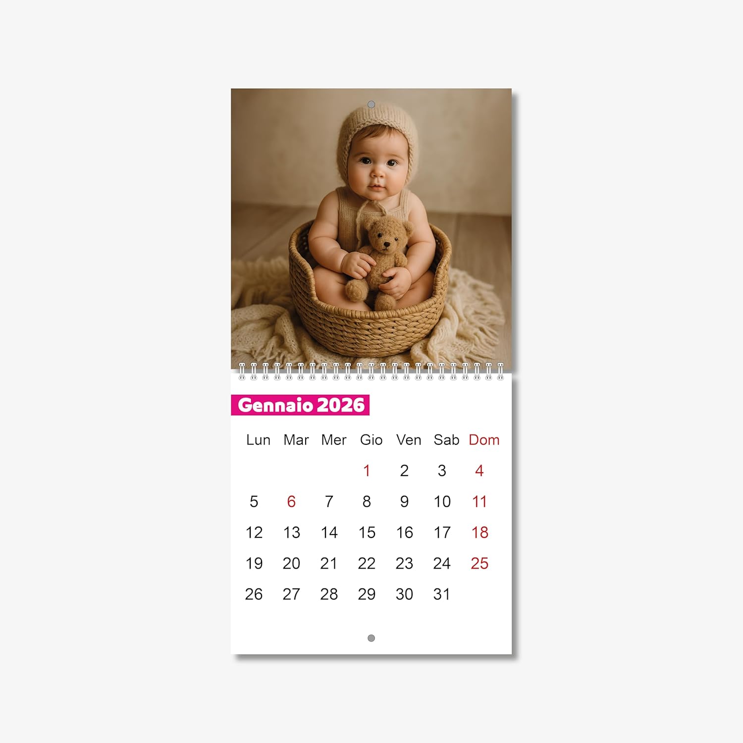 Porta ordine e bellezza sulla tua scrivania con il nostro Calendario da Tavolo. Realizzato con spirale metallica bianca e stampato su cartoncino premium da 300g, garantisce colori intensi e dettagli nitidi. Ogni mese diventa speciale grazie alla possibilità di personalizzare le pagine con le tue foto o immagini preferite, trasformando un semplice planner in un oggetto unico e personale.